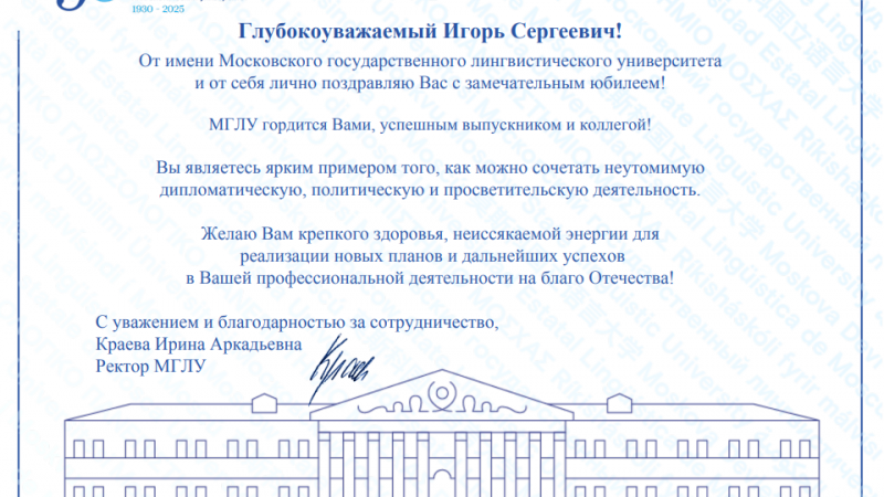 МГЛУ от всей души поздравляет своего выдающегося выпускника с этой знаменательной датой! Мы желаем Игорю Сергеевичу долгих лет жизни, неиссякаемой энергии, профессиональных успехов и личного благополучия! Пусть ваш жизненный путь станет примером безупречного служения Родине для нынешних и будущих дипломатов!